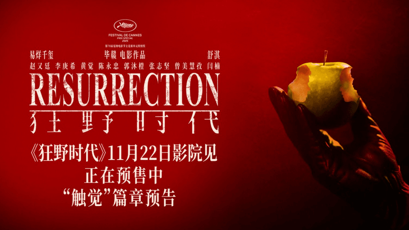 将于11月22日上映的艺术电影《狂野时代》今日发布“触觉”篇章预告及海报,影片正在预售中。本片由毕赣执导,易烊千玺、舒淇领衔主演,赵又廷特邀主演,李庚希特别出演,黄觉、陈永忠、郭沐橙主演,张志坚、曾美慧孜、闫楠友情出演,并荣获第78届戛纳电影节主竞赛单元特别奖。影片讲述一个怪物通过体验视觉、听觉、味觉、嗅觉、触觉五种感官,穿越一个世纪的狂野幻梦。今日发布第五篇章“触觉”预告,易烊千玺饰演的“迷魂者”来到世纪末,预告和海报中大面积浓郁炽烈的红色极具视觉冲击力,少年自由不羁、无所顾忌,在大雨中肆意奔跑,传递出极致的写意浪漫与畅快感受。